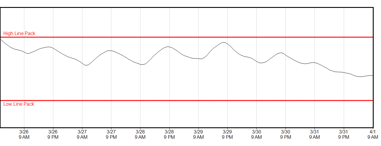 Effective Feb. 24, 2025, the High/Low Line Pack range is 350,000 Mcsf. The high/low line pack band is adjusted from time-to-time for reasons including, but not limited to, seasonal weather changes, impacts due to maintenance events, and changes to shipper nomination patterns.